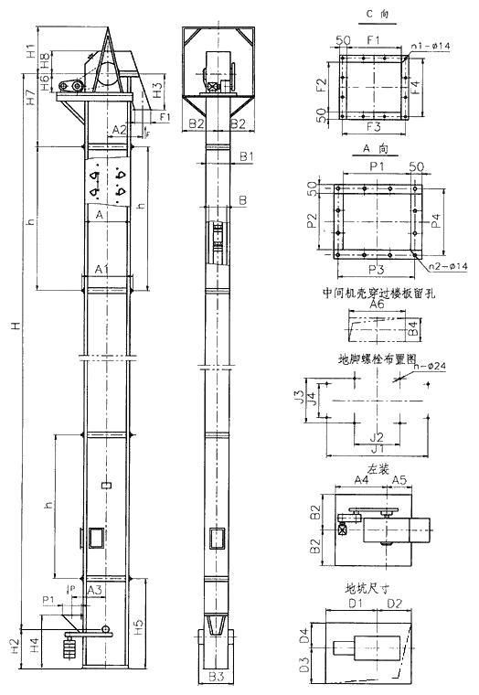NE系列板鏈斗式提升機外形示意圖: